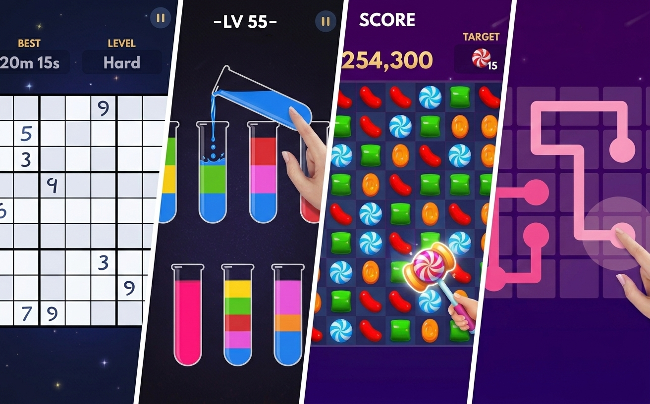 Match-3 (Candy Crush), logic (Sudoku.com, Nonogram.com), spatial (1010!, block puzzles), and relaxed premium puzzles (The Room, Zenge) cover most tastes.