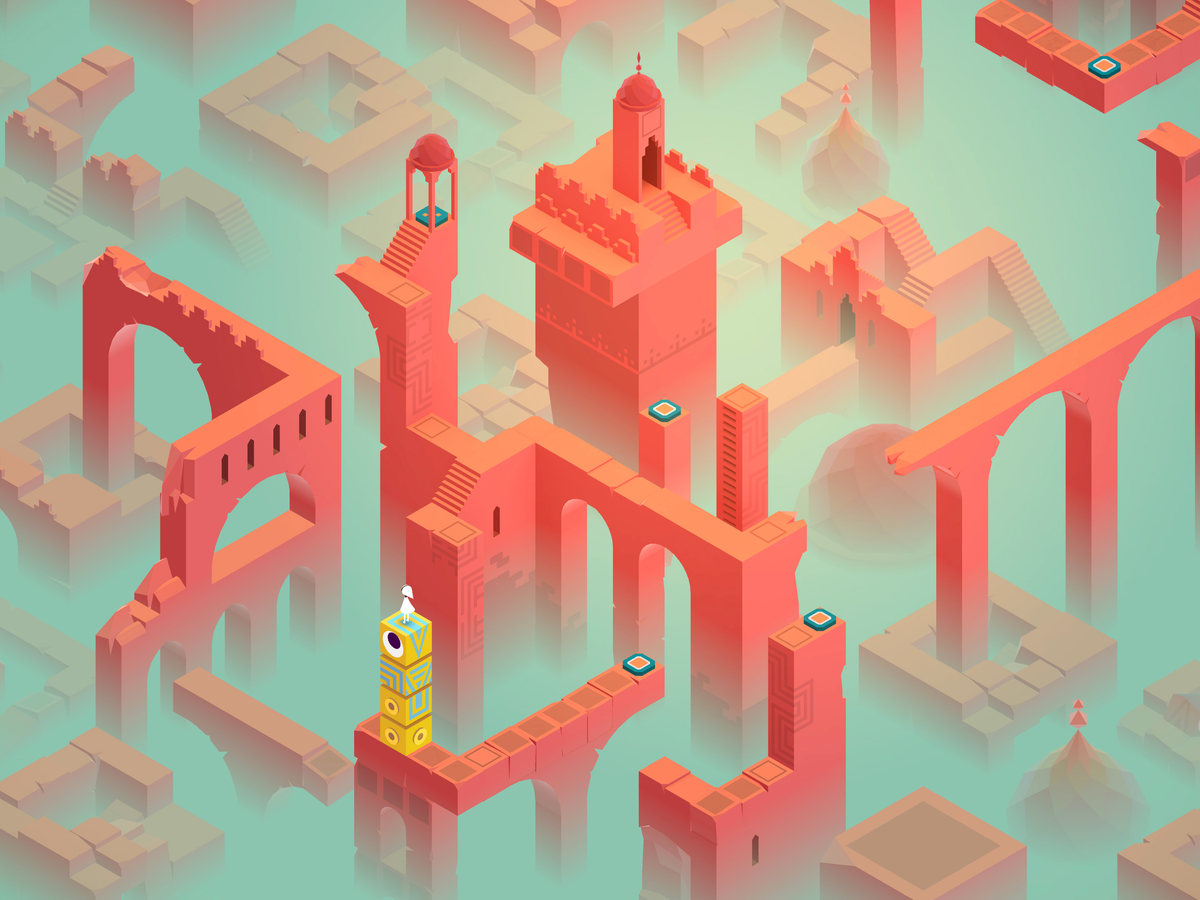 A tiny white figure stands on a yellow totem in a surreal, pastel-colored architectural dreamscape. Monument Valley is a premium puzzle that feels like playable art. You guide a character through impossible geometry by rotating and shifting architecture. It teaches through touch and curiosity, not long instructions. For beginners, it’s one of the gentlest “wow” experiences you can buy.