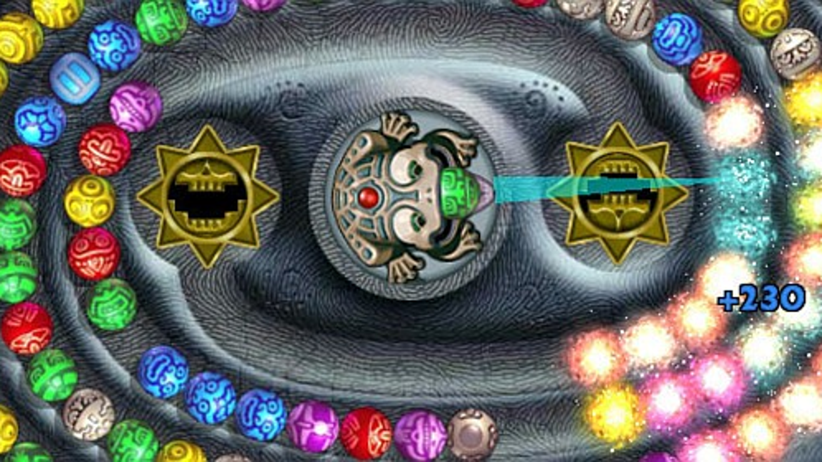 Stone frog idol firing colored spheres in Zuma gameplay Zuma Deluxe is not a pure jewel-board game, but it is one of the clearest adjacent classics in this space. It swaps gem-swapping for marble-shooter chain clearing, which makes it a related alternative rather than a direct substitute.