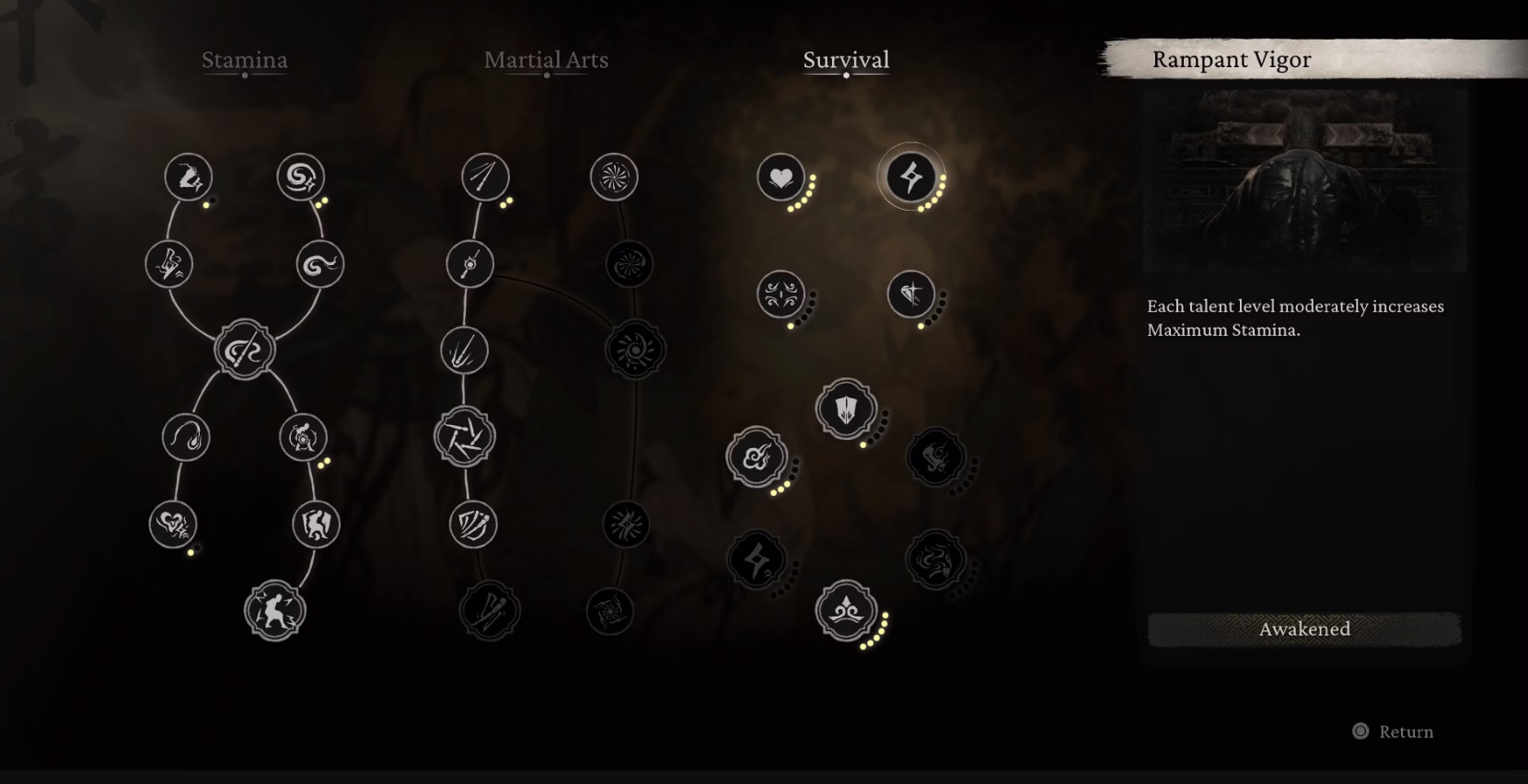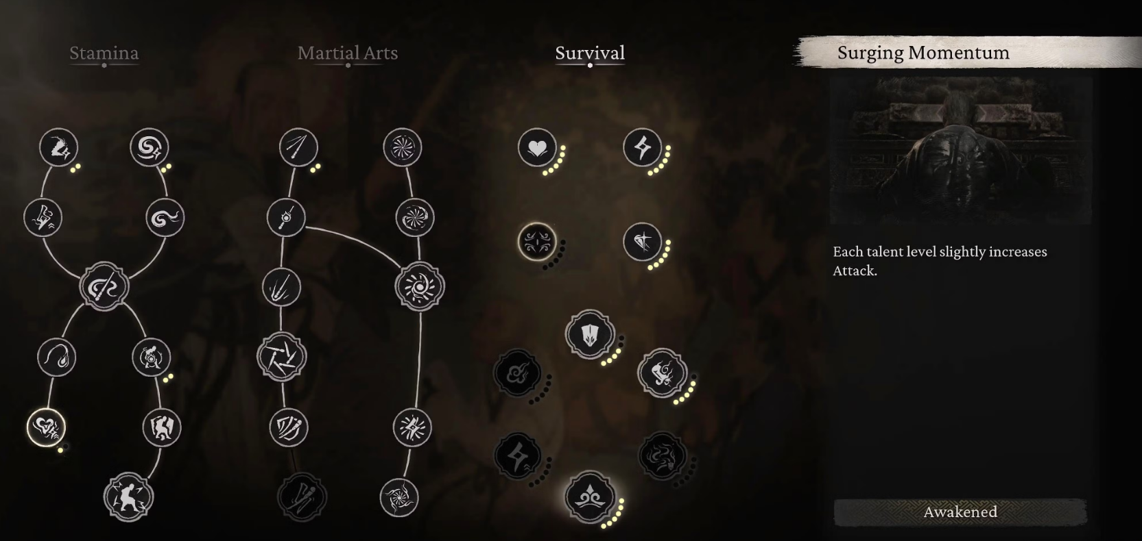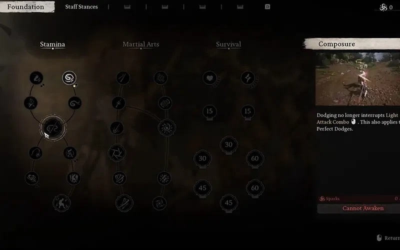 Foundation:Divided into Stamina, Martial Arts, and Survival. Here, you'll find abilities that reduce stamina consumption, increase your health, and upgrade your standard attacks.