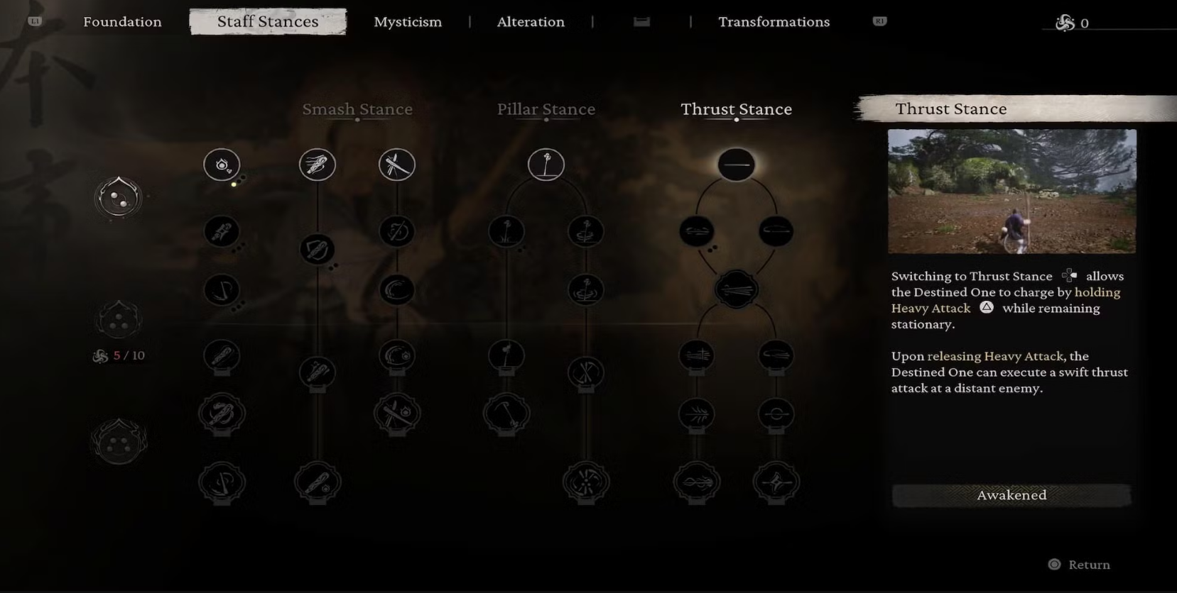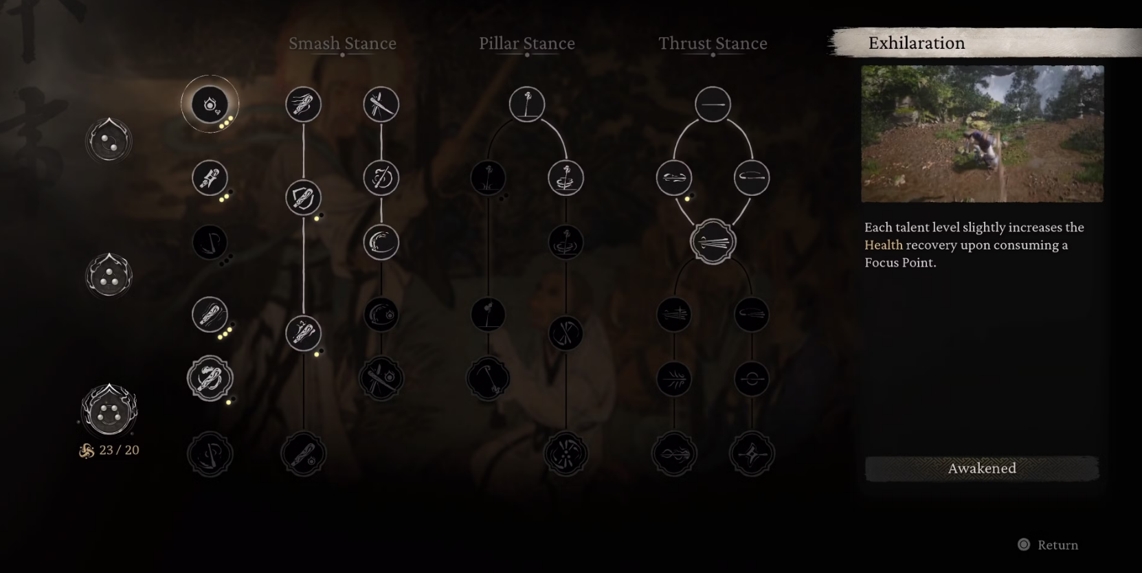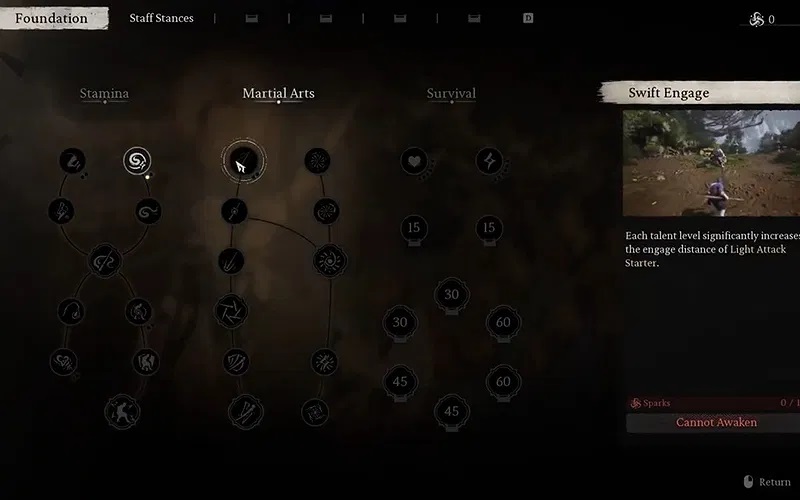 Staff Stances:Comprising Smash Stance (your starting point), Pillar Stance, and Thrust Stance. Pillar Stance unlocks at Level 5, and Thrust Stance cannot be unlocked until you reach Level 20 (often achieved shortly after starting Chapter 2). The left-hand side of this tab also features uncategorized skills that boost health recovery, damage, and stamina recovery, and some automatically unlock as you sink more points, granting additional Focus Points.