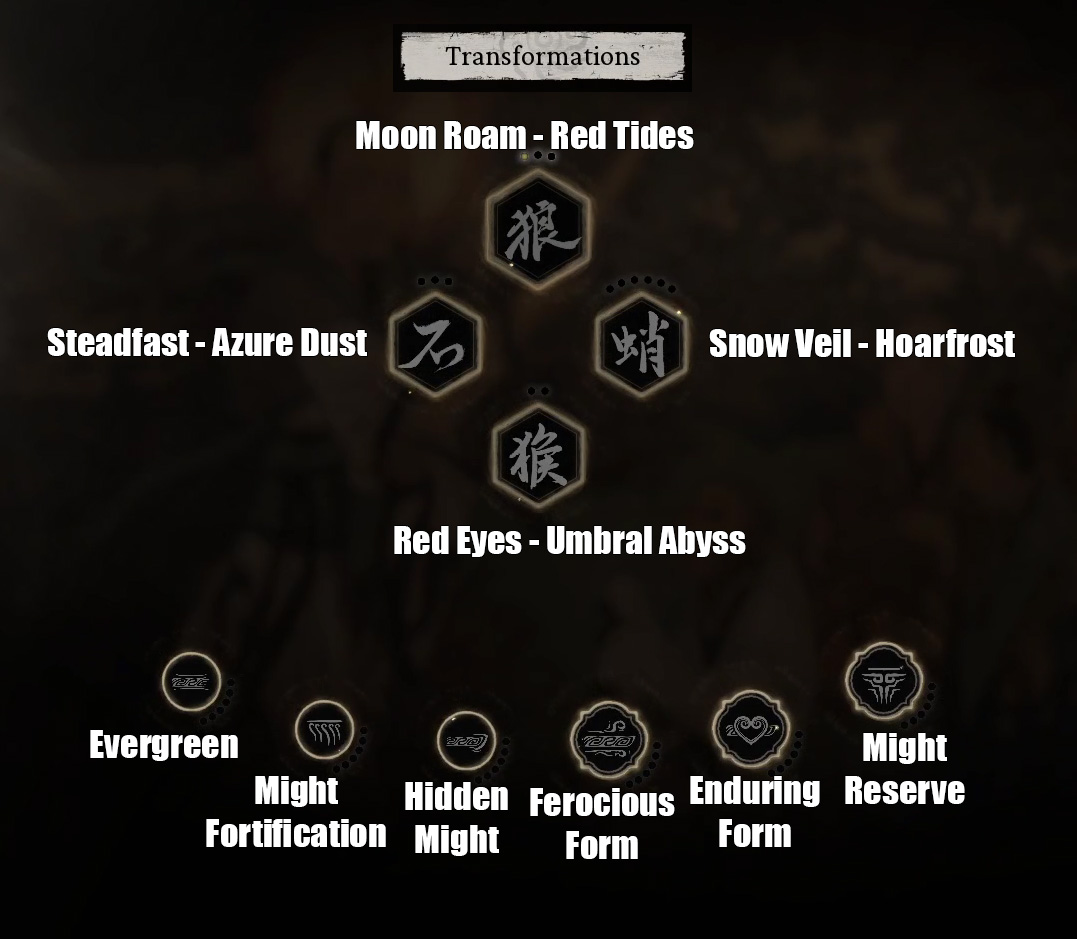 Transformations: This panel applies to any Transformation spells you collect. Here, you'll find skills to improve Might recovery, maximum health when transformed, increased defense, and more. Notably, large nodes unlocked by defeating major deities grant passive benefits even when you're not actively transformed, while smaller nodes at the bottom of the panel enhance effects specifically when you aretransformed.