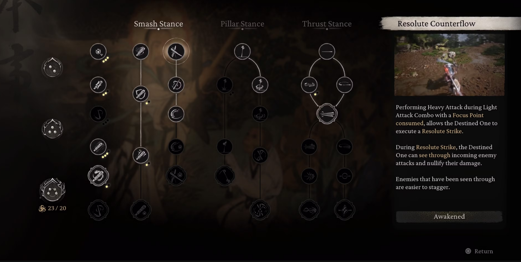 (Smash Stance) Perform a Heavy Attack during a Light Attack combo to consume a Focus Point and perform "Resolute Strike" (an aggressive counter that can stun enemies).