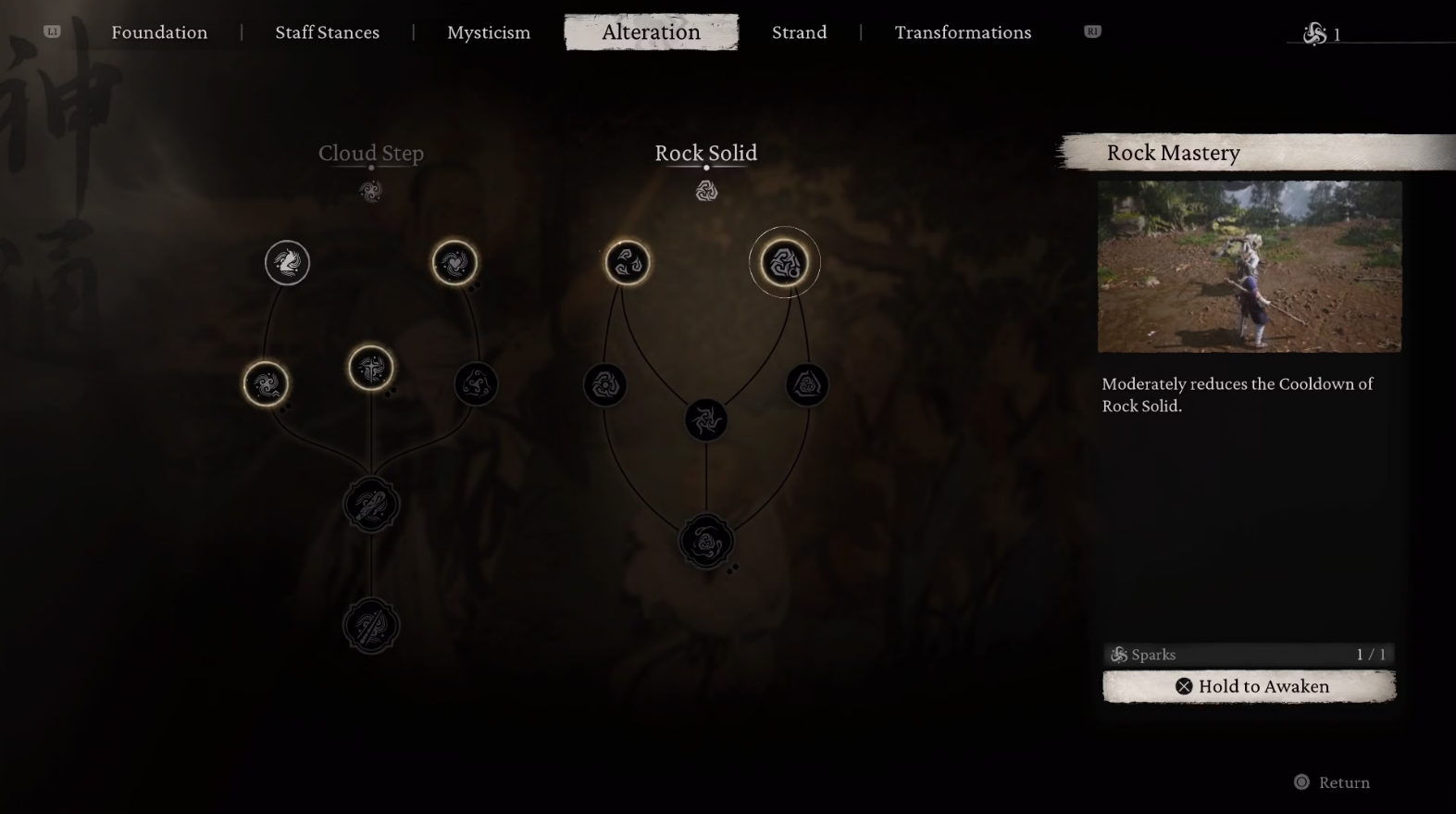 A screenshot of a skill tree in Black Myth: Wukong, Alteration tab given the displayed skills