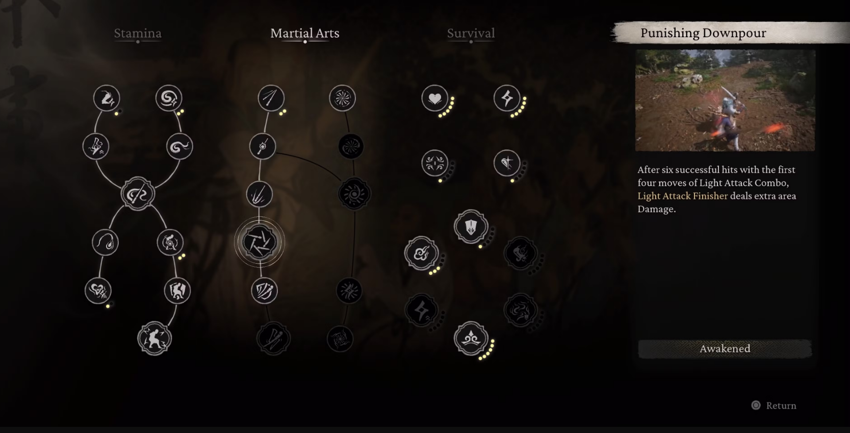 Punishing Downpour (Martial Arts):Makes your Light Attack Finisher deal extra Damage after six successful hits. Boosts consistent damage output.