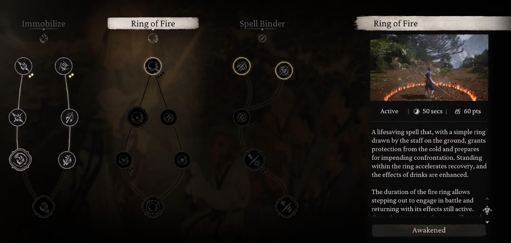 Strategic Impact:Creates a flaming circle around Wukong. Generates Focus (via Raging Flames) and recovers health (via Consolidation) when inside. May offer protection against cold.