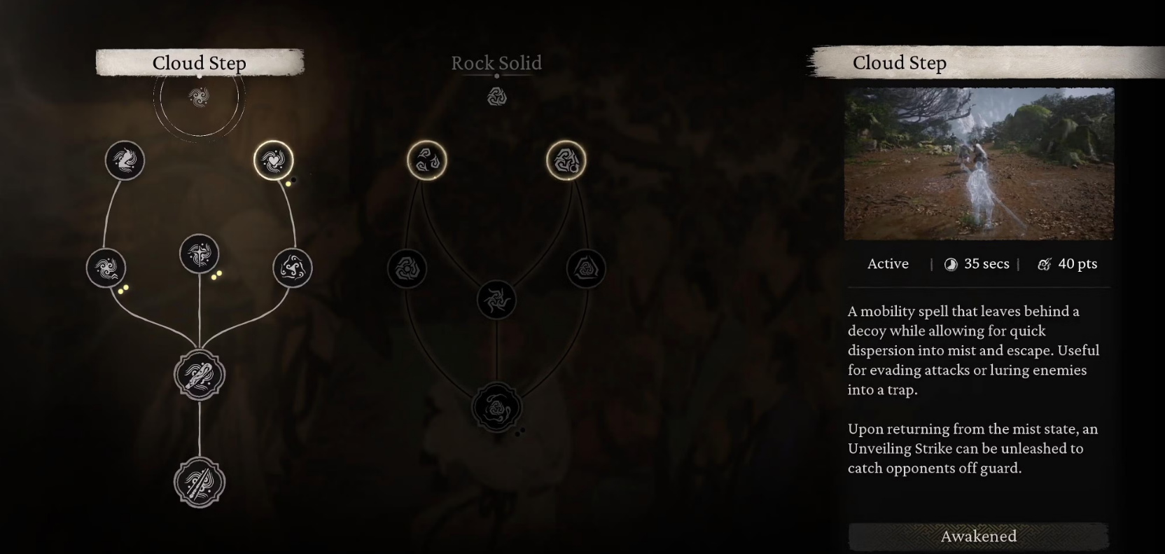 The Alteration tree focuses on spells like Cloud Step and Rock Solid, offering unique movement and defensive capabilities.
