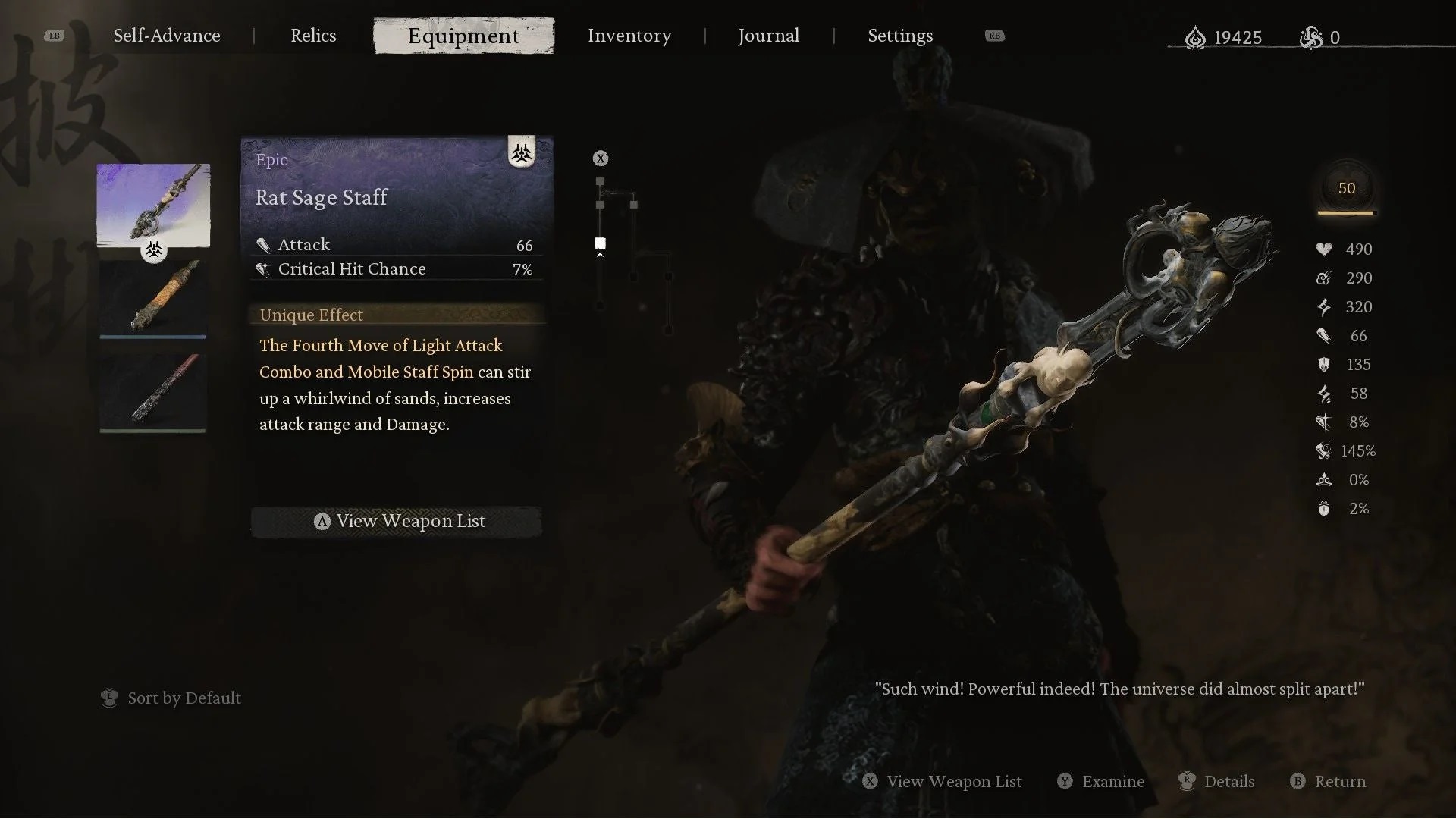 Chapter 4 introduces strong mid-game gear like Rat Sage Staffand Golden Loong Staff. However, the most powerful and mythical staffs are found in Chapters 5–6 and NG+. Chapter 4 is where you prep for endgame weapons.