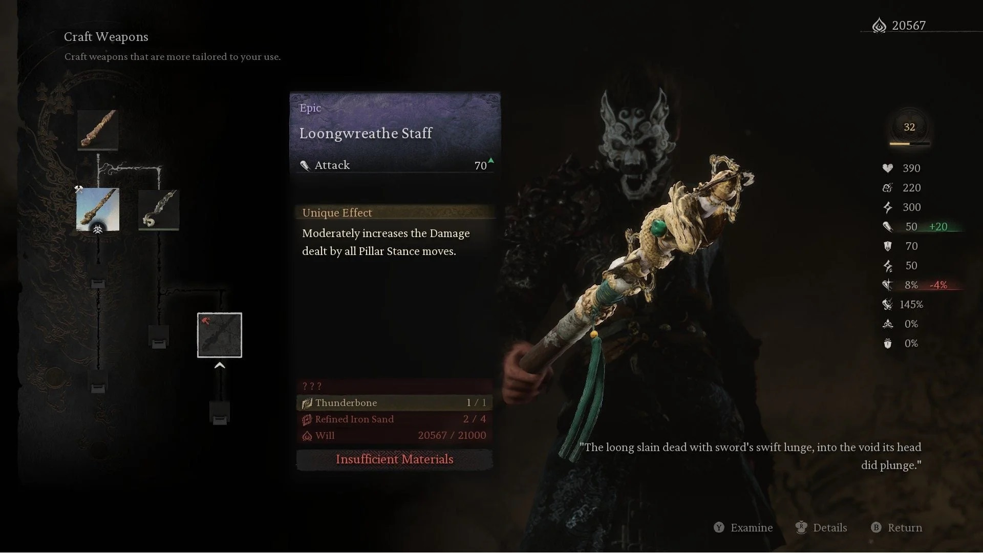 With a strong 70 base attack, the Loongwreathe Staff is often underestimated due to its niche design. It specifically enhances Pillar Stance abilities - a stance that rewards vertical strikes, juggling, and precise mid-range pressure. If you favor aerial combos and anti-air counters, this staff unlocks bonus potential early on.