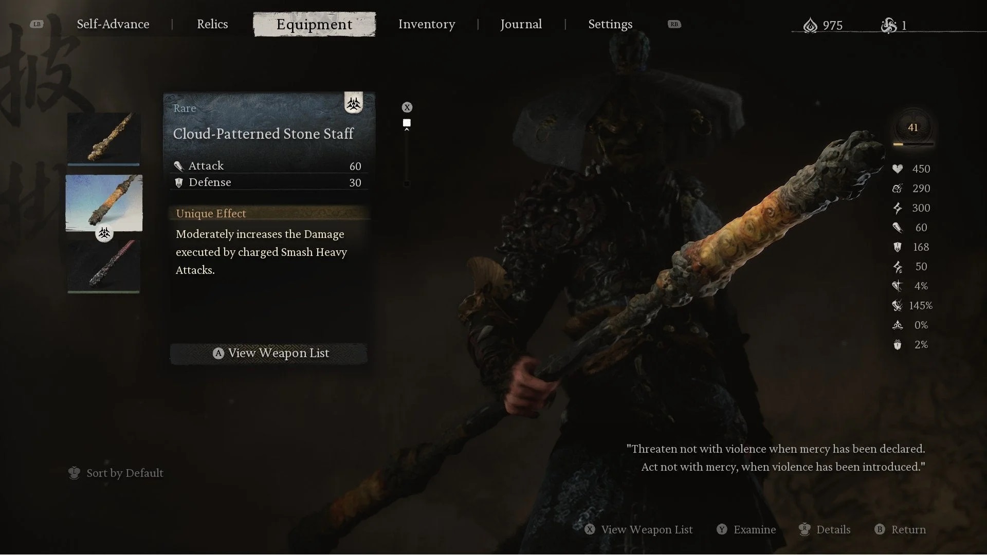 In-game screenshot from Black Myth: Wukong's Equipment menu, showing the "Cloud-Patterned Stone Staff" with 60 Attack, 30 Defense, and a unique effect boosting charged Smash Heavy Attacks.