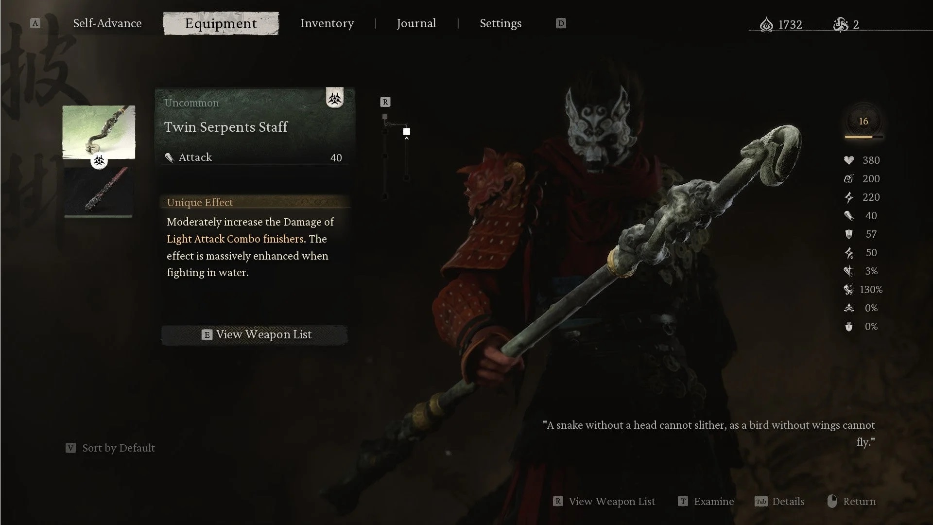 In-game screenshot from Black Myth: Wukong's Equipment menu, showing the "Twin Serpents Staff" with 40 Attack, and a unique effect moderately increase the Damage of Light Attack Combo finishers.