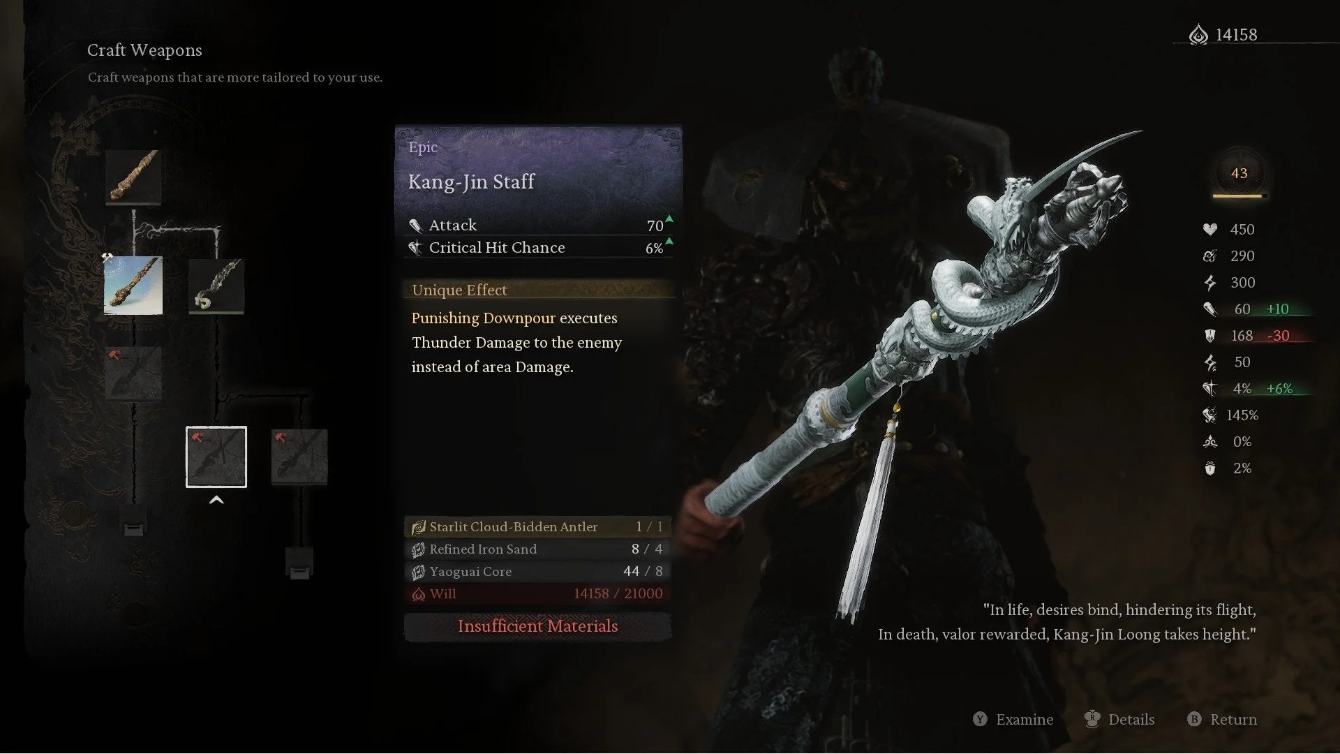 With a solid 70 base attack and 6% crit rate, the Kang-Jin Staff is specialized for Thunder spell builds, specifically boosting the damage of the “Punishing Downpour” skill by 40%.