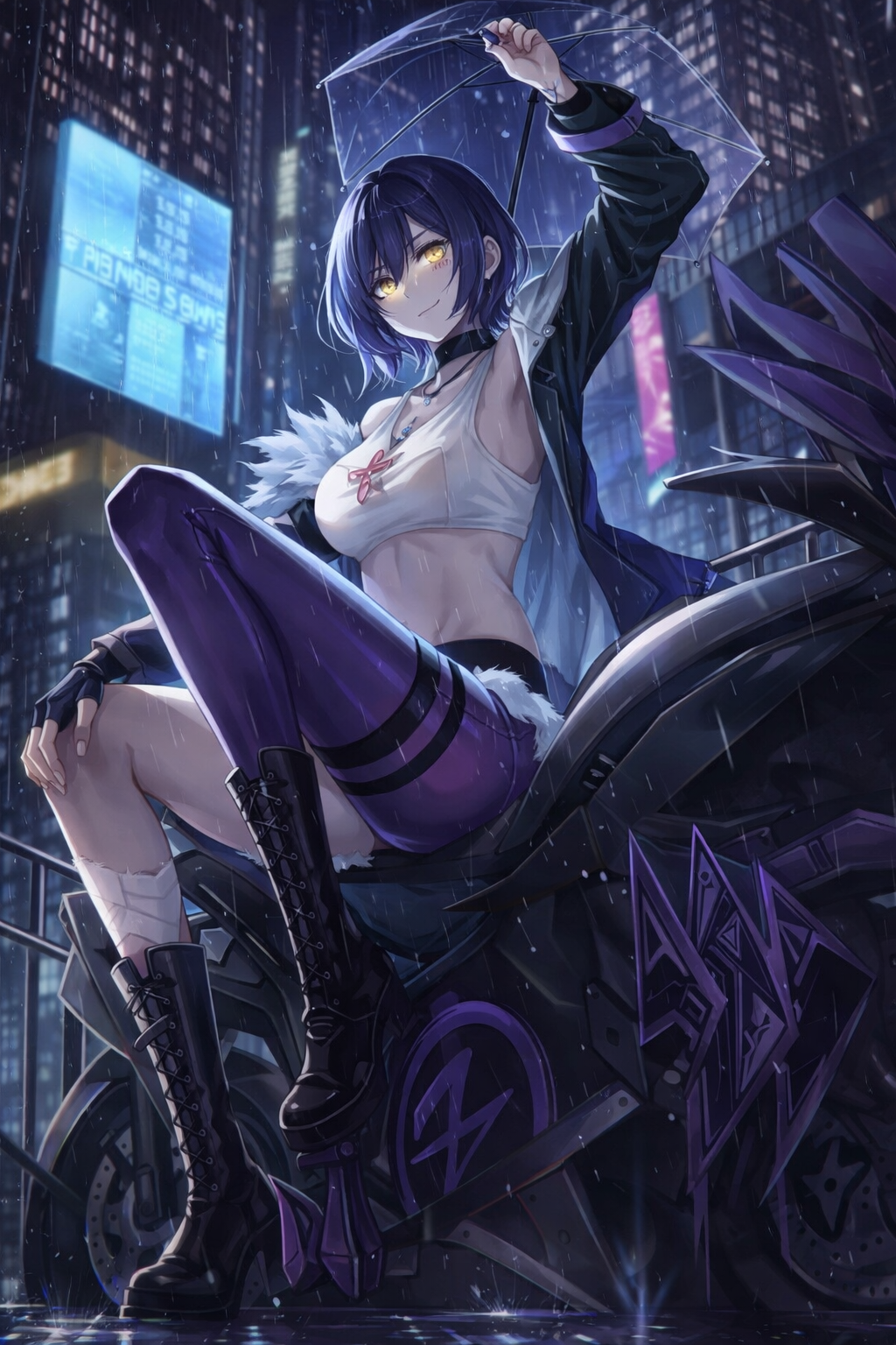 Zola Chasing Kaleidorider character anime girl with umbrella night city motorcycle calm disrupter unit Zola offers a more focused and controlled approach to combat.