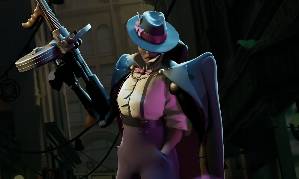 A woman with a tommy gun in a dark, urban environment