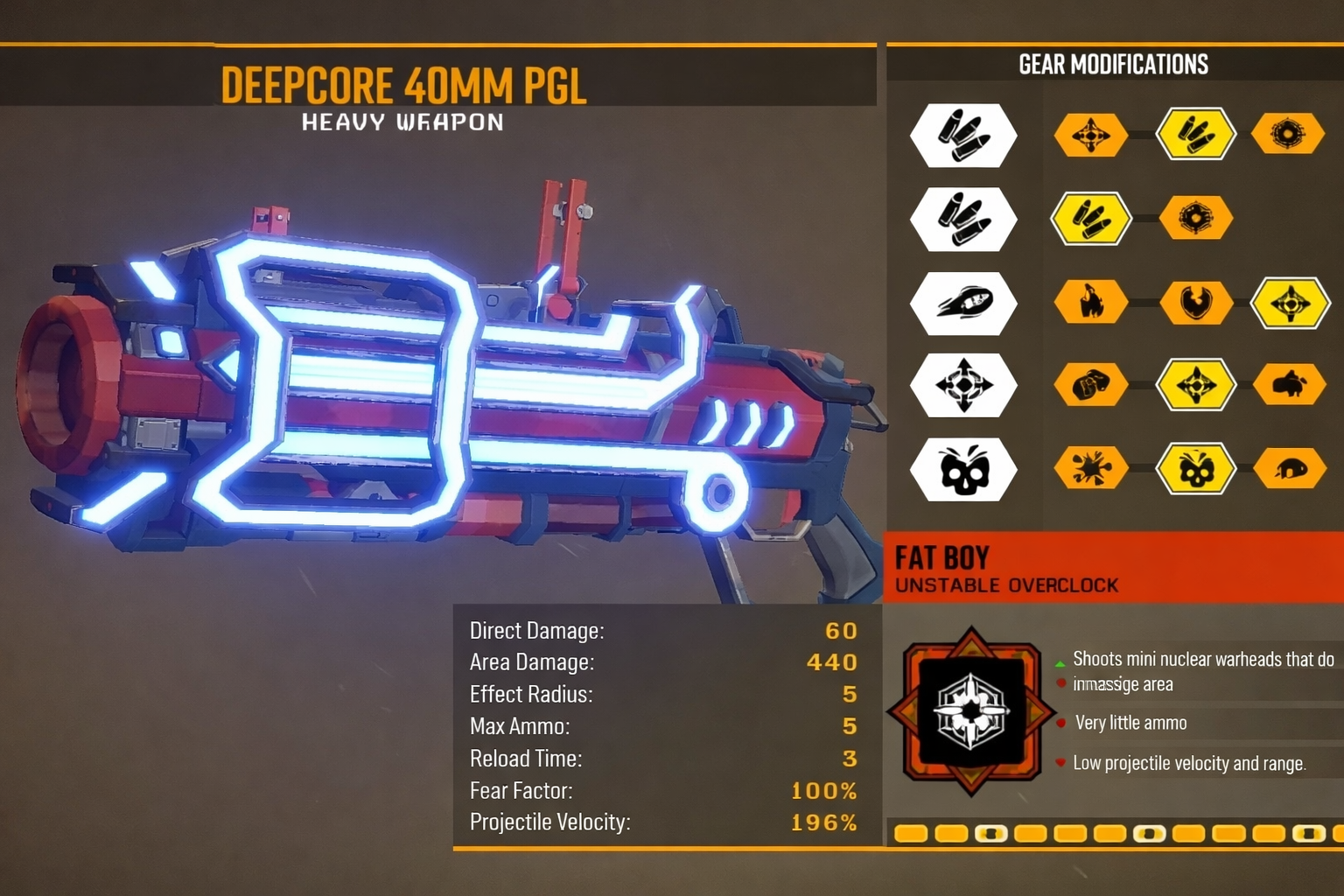 Deep Rock Galactic Fat Boy overclock Deepcore PGL grenade launcher stats and build setup Fat Boy still belongs near the top, but I think it deserves a more honest explanation than it usually gets. A lot of people talk about Fat Boy like it is just a giant meme nuke, but that undersells why it is actually strong. The blast is obviously incredible, but the real power is in how much space it controls after the shot lands.