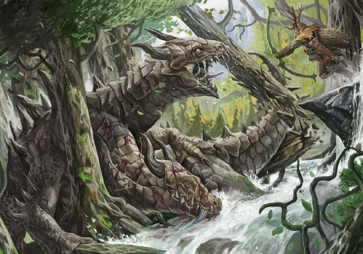 An antlered, humanoid druid wearing a bearskin headdress and carrying a bow, stands on a rocky outcrop above a rushing river. Archetypes are specialized versions of the base class that trade some abilities for others. They are a great way to fine-tune your Pathfinder druid build.
