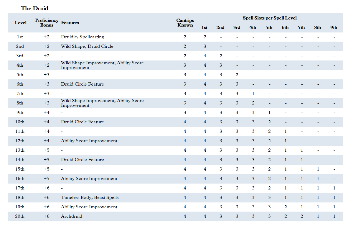 A simple table detailing the progression of the Druid class in Pathfinder. Understanding the druid's toolkit is the first step to mastering the class. Unlike a fighter who relies on a single set of skills, a druid's power comes from a synergy of diverse abilities.