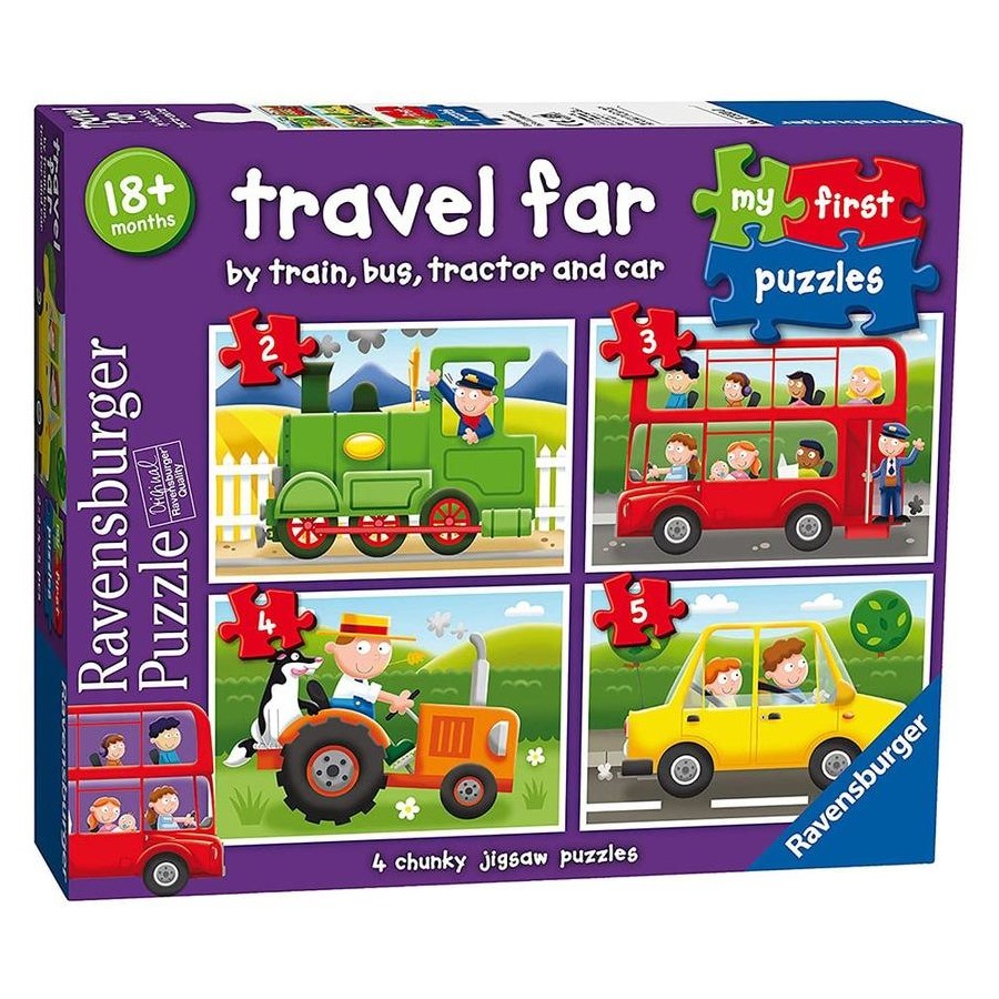 Ravensburger “Travel Far” Puzzle Ravensburger’s My First Travel Far puzzle set is like a little ticket to adventure for toddlers! Inside the box, you’ll find four mini puzzles with just 2, 3, 4, and 5 chunky pieces, perfect for tiny hands. Each puzzle shows a cheerful vehicle, like a green train, a bright red double-decker bus, a friendly tractor, and a speedy little car, all in bold, happy colors.