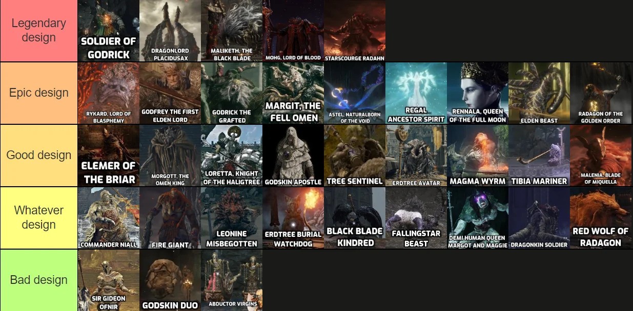 - Godrick the Grafted -Early in Stormveil Castle, Godrick attaches a dragon head for fiery attacks. He’s tough for newcomers but simpler later on. Some players rate him as low as C-tier, calling him a manageable starter boss.