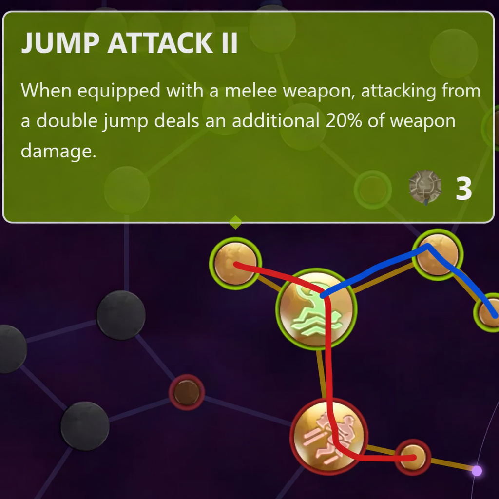 Enshrouded Double Jump skill upgrade showing Jump Attack II with increased melee damage from aerial attacks Still the most important skill in the game and the foundation of nearly every strong build.