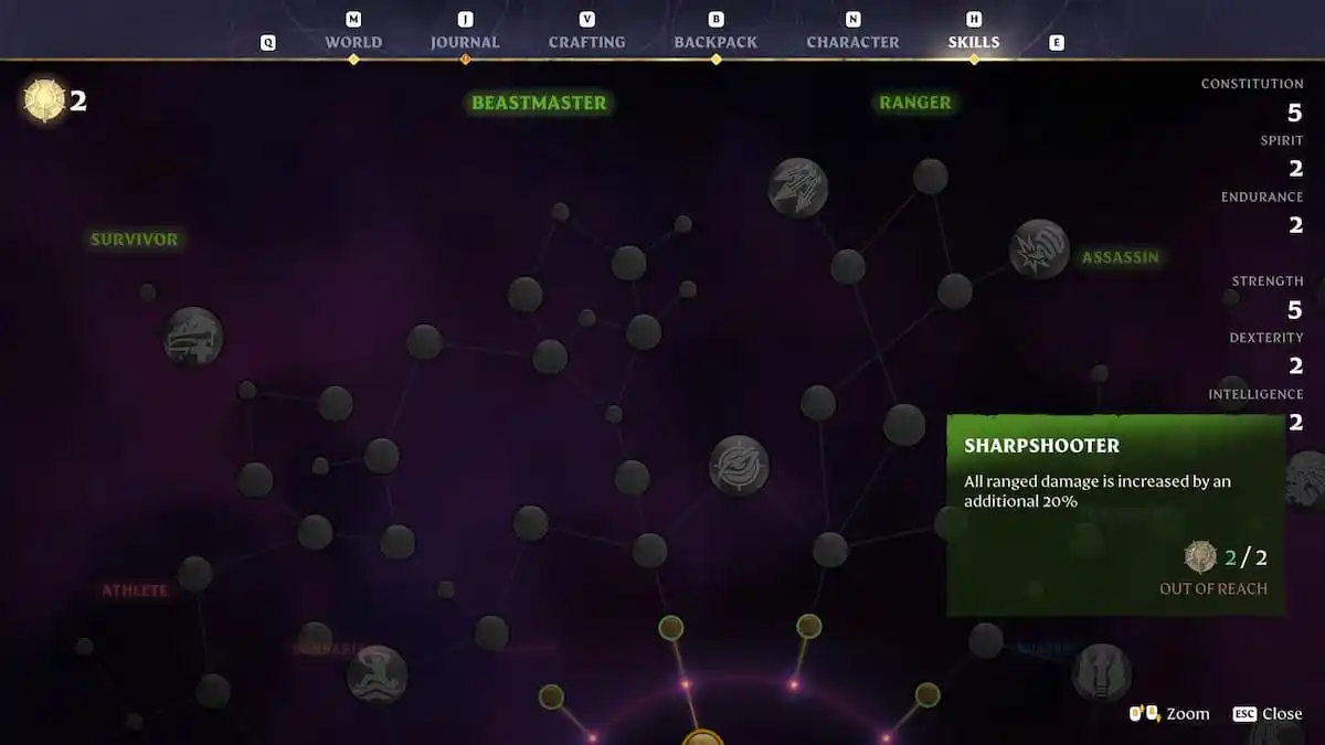 Enshrouded Sharpshooter skill showing increased ranged damage bonus in the skill tree Improves ranged accuracy and damage, making it vital for bow users.