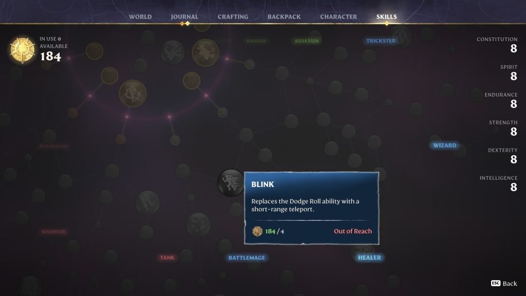 Enshrouded Blink skill showing teleport ability replacing dodge roll in the skill tree A top-tier defensive and utility skill that remains essential in high-level gameplay.