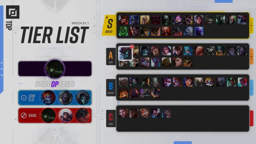 Tier listsshow how well champions are doing in the current game meta. They use things like win rates, how often they’re picked, and how pros play them to rank champions. Champions are grouped into tiers: