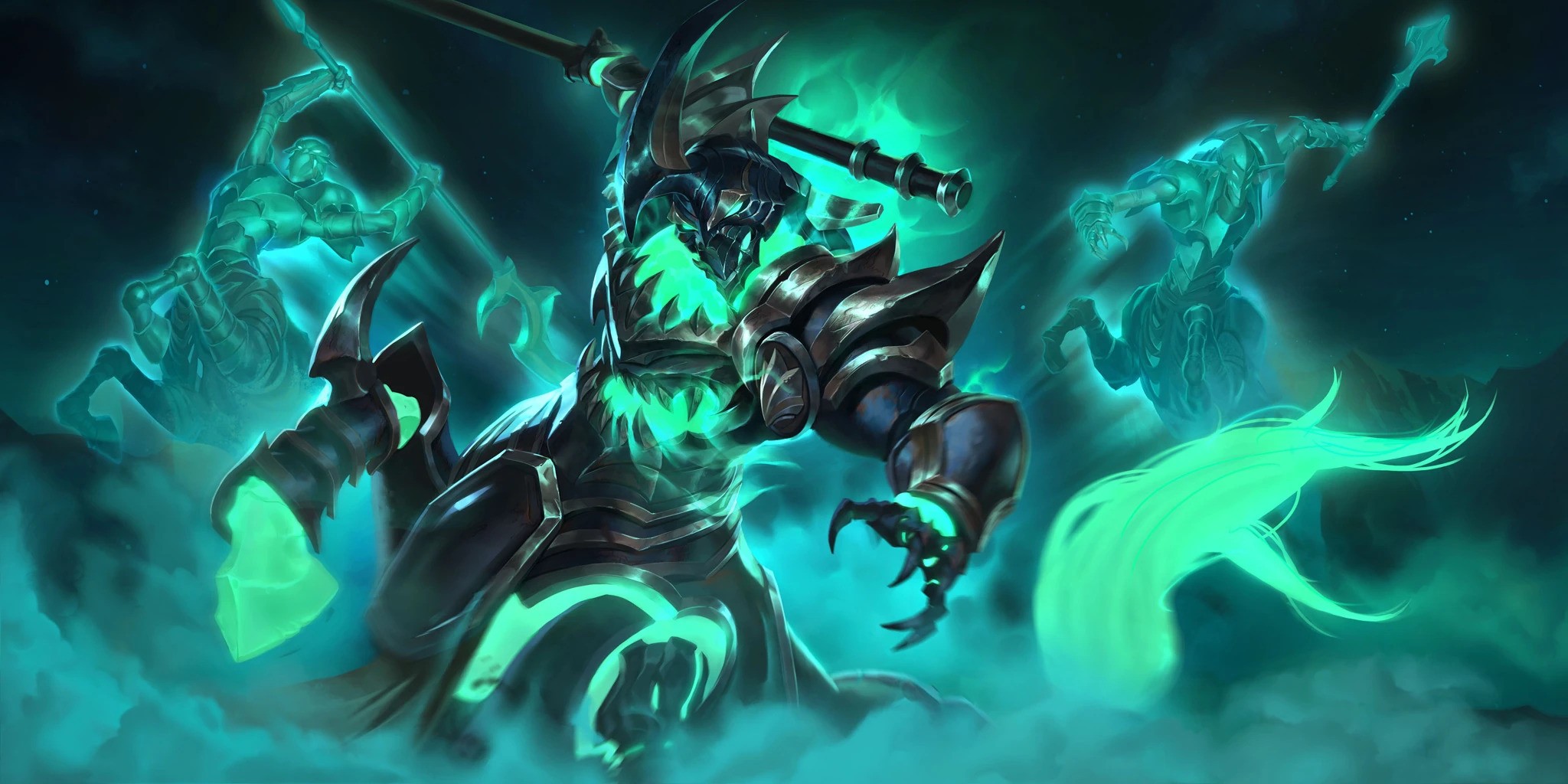 Hecarim is a tough fighter with fast movement and strong area damage. His Q scares enemies, and his E increases his speed, helping him jump into fights quickly.
