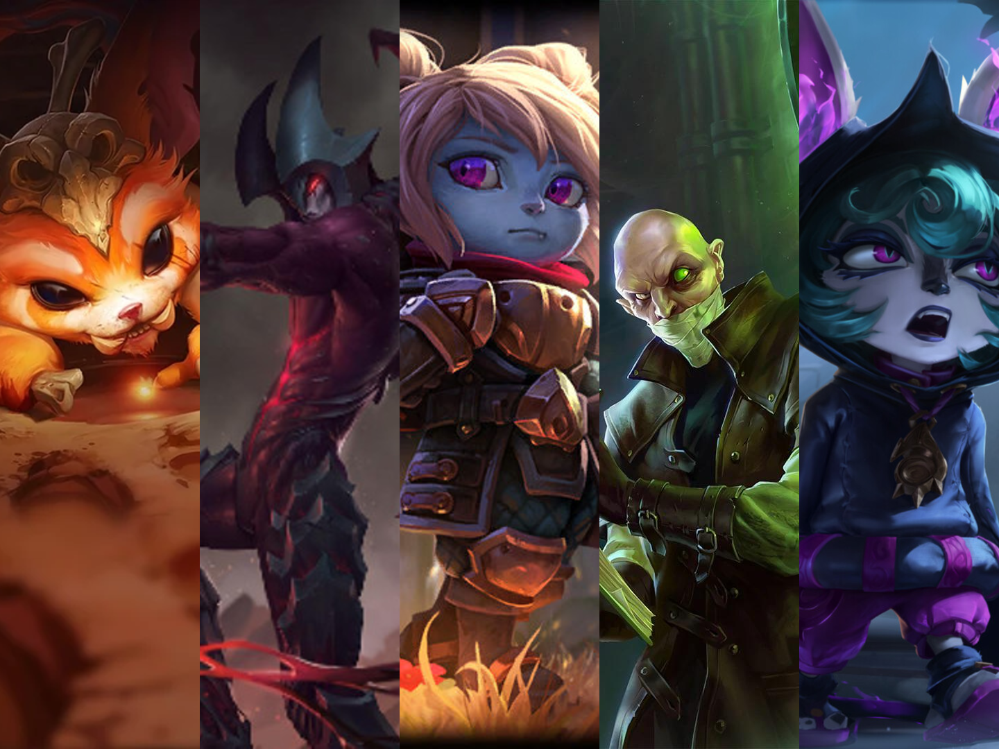 A collage image of Gnar, Aatrox, Poppy, Singed, & Vex. These champions are situational in ARAM. They can perform well with the right team comps or snowball potential, but they generally lack consistency compared to higher-tier picks.