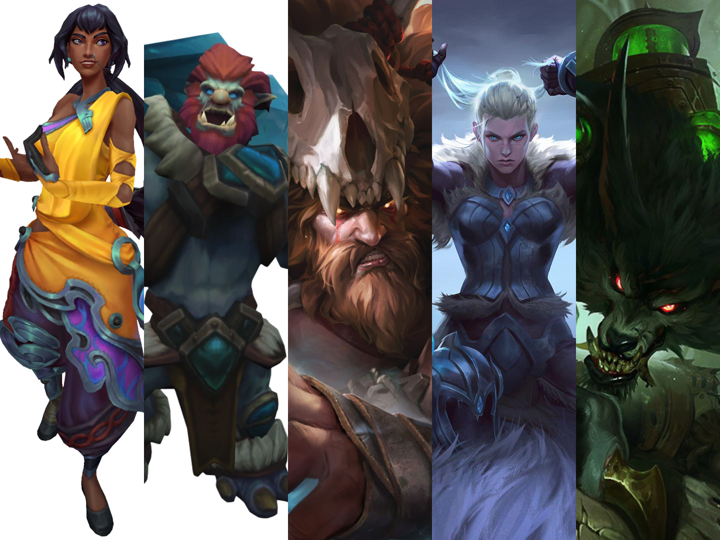 A collage image of Nilah, Trundle, Udyr, Warwick, & Sejuani. Champions in this bracket struggle in ARAM due to limited poke, reliance on flanking, or scaling conditions that are hard to achieve without lane phases. They often lack consistency compared to ranged poke or sustain-heavy champions that dominate ARAM.