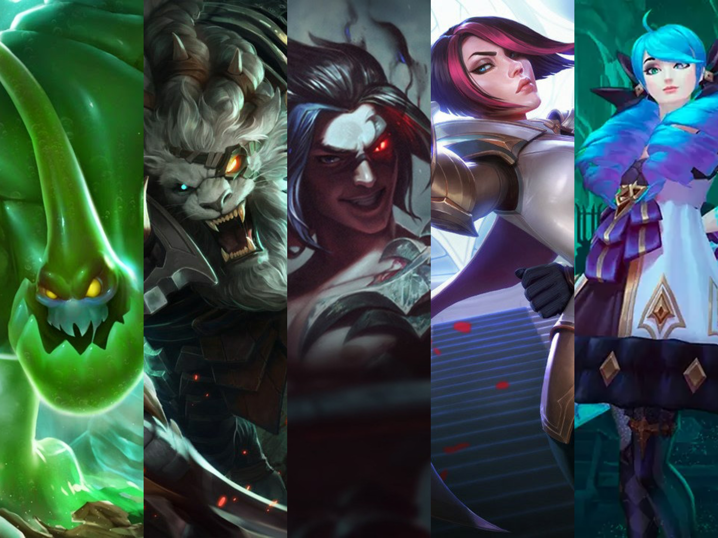 A collage image of Zac, Rengar, Kayn, Fiora, & Gwen. These champions have the lowest performance in ARAM. They suffer from long cooldowns, reliance on scaling, or poor synergy in poke-heavy, teamfight-centric maps. Most struggle to consistently contribute without their ideal setups.
