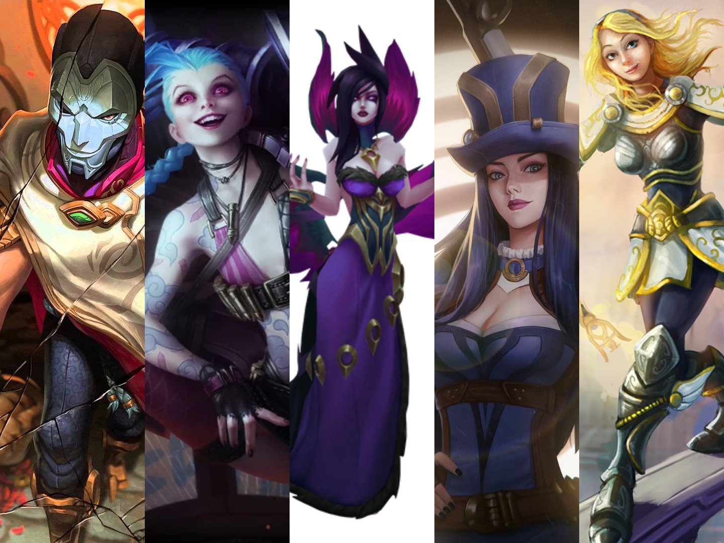 A collage image of Jhin, Jinx, Morgana, Caitlyn & Lux. These champions consistently show the highest win rates in ARAM. They thrive because of their poke, AoE damage, crowd control, and strong teamfight presenceon the single-lane Howling Abyss map.