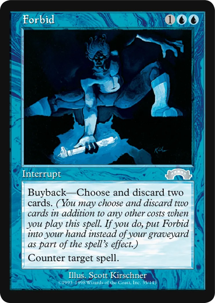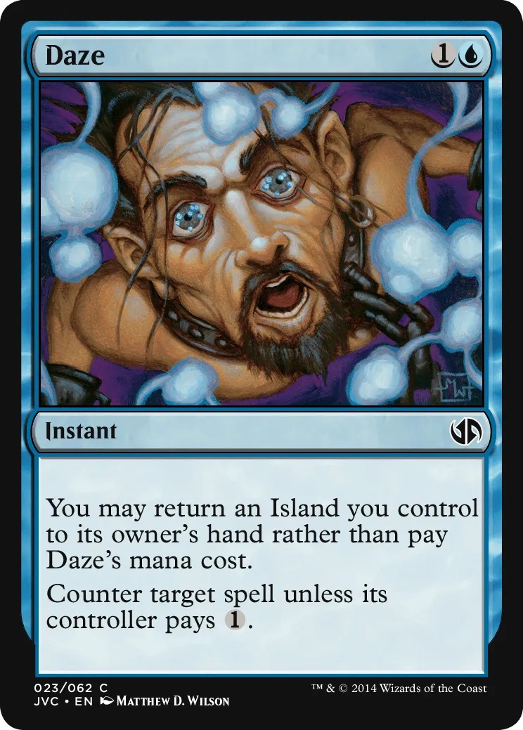 Daze (1U or return an Island), from Nemesis (2000), is a “free” soft counter for tempo decks like Legacy Delver. Bouncing an Island allows tapping out for threats while holding up interaction, perfect for decks with cheap threats like Delver of Secrets