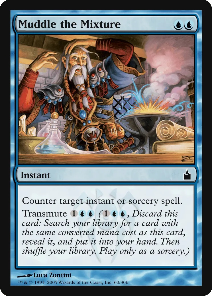 Muddle the Mixture (UU), from Ravnica (2005), counters an instant or sorcery and transmutes for a mana value 2 card. In Modern, it’s a combo piece in Ad Nauseam, tutoring Lightning Storm. In Commander, it fetches Isochron Scepter or Cyclonic Rift.