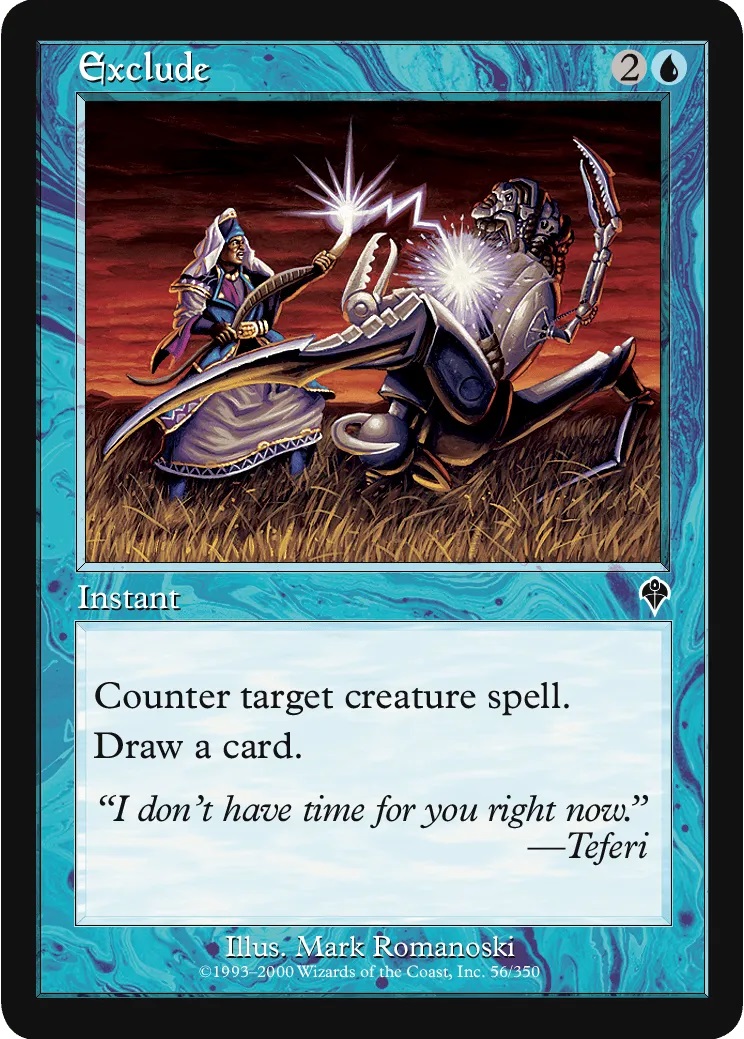 Exclude (2U), from Invasion (2000), counters a creature spell and draws a card. In Commander, it’s a tempo play against creature-heavy decks, while in Limited, it’s a two-for-one against bombs.