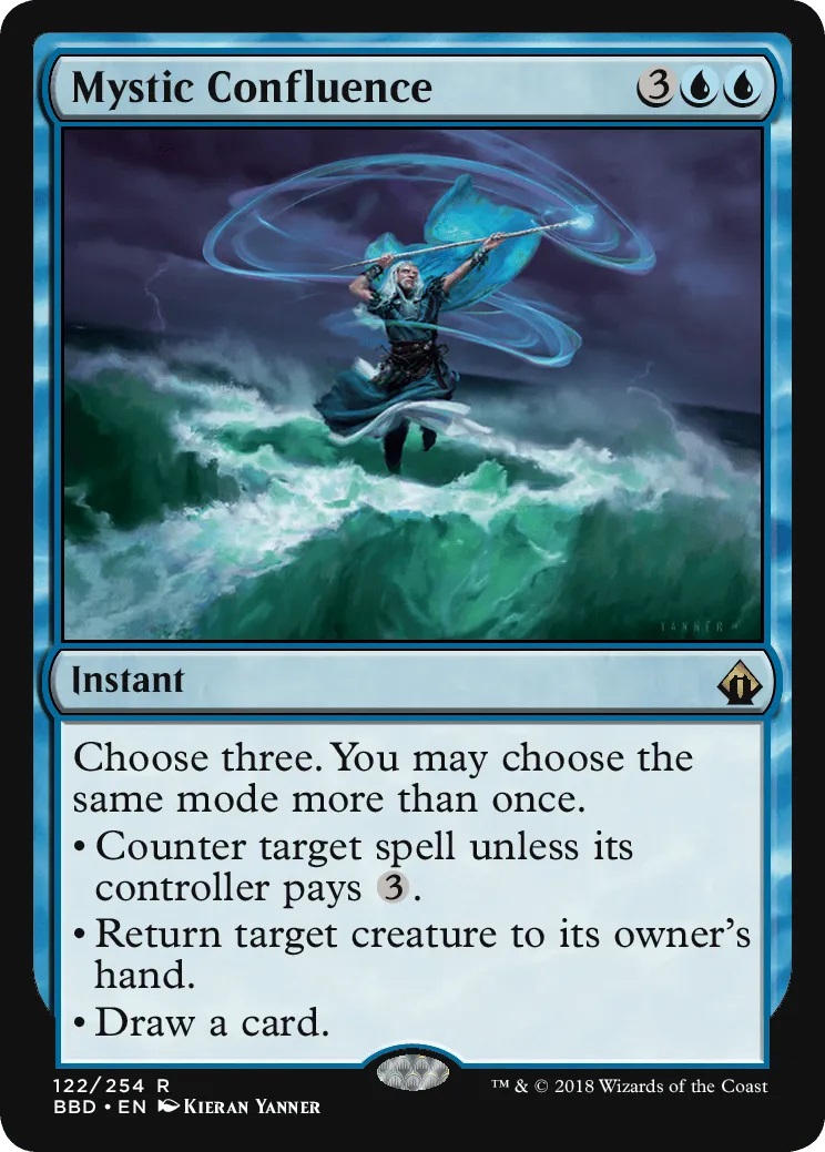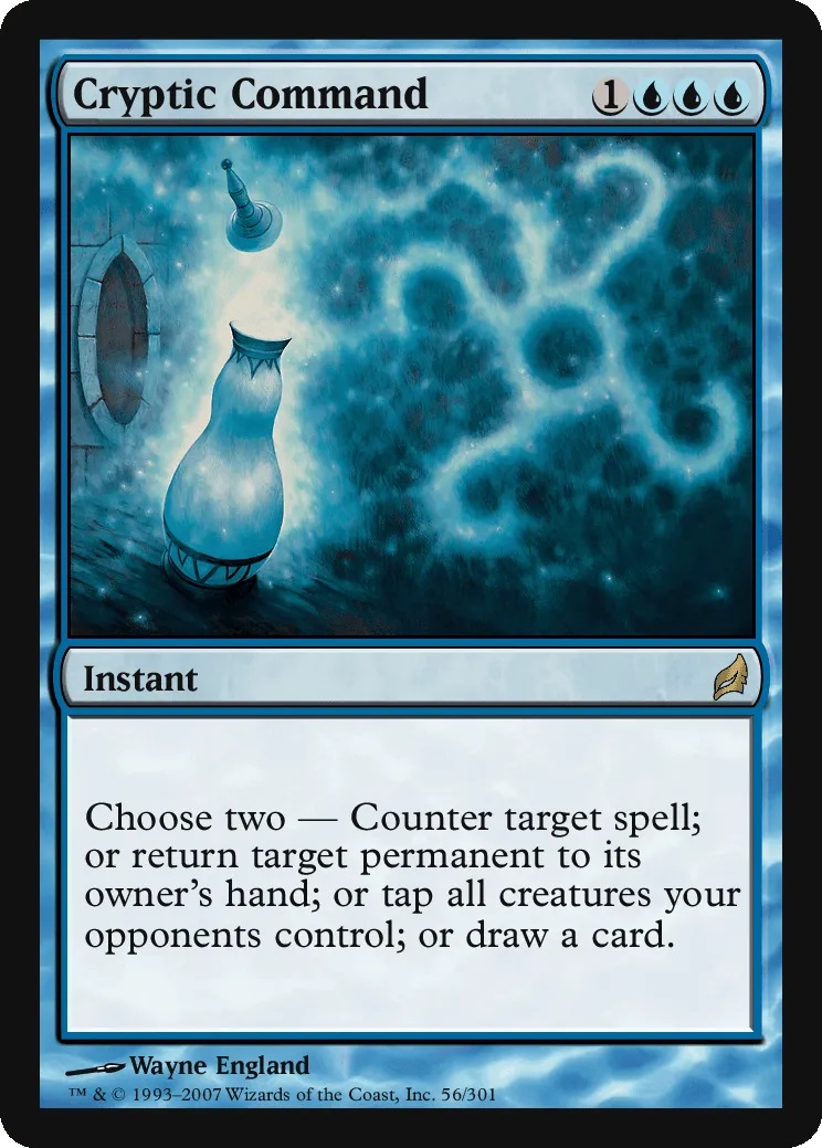Cryptic Command (1UUU), from Lorwyn (2007), offers four modes: counter a spell, draw a card, return a permanent, or tap all opponent’s creatures. Most often used to counter and draw, it’s a Modern (Azorius Control) and Commander staple.
