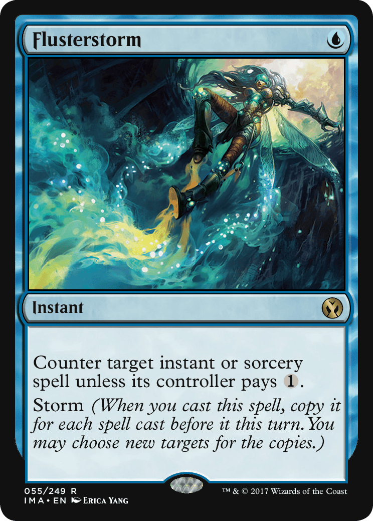 Flusterstorm (U), from Commander 2011, counters an instant or sorcery, creating copies for each spell cast this turn. It’s a Legacy and Vintage powerhouse against storm decks (e.g., The Epic Storm) or control mirrors.