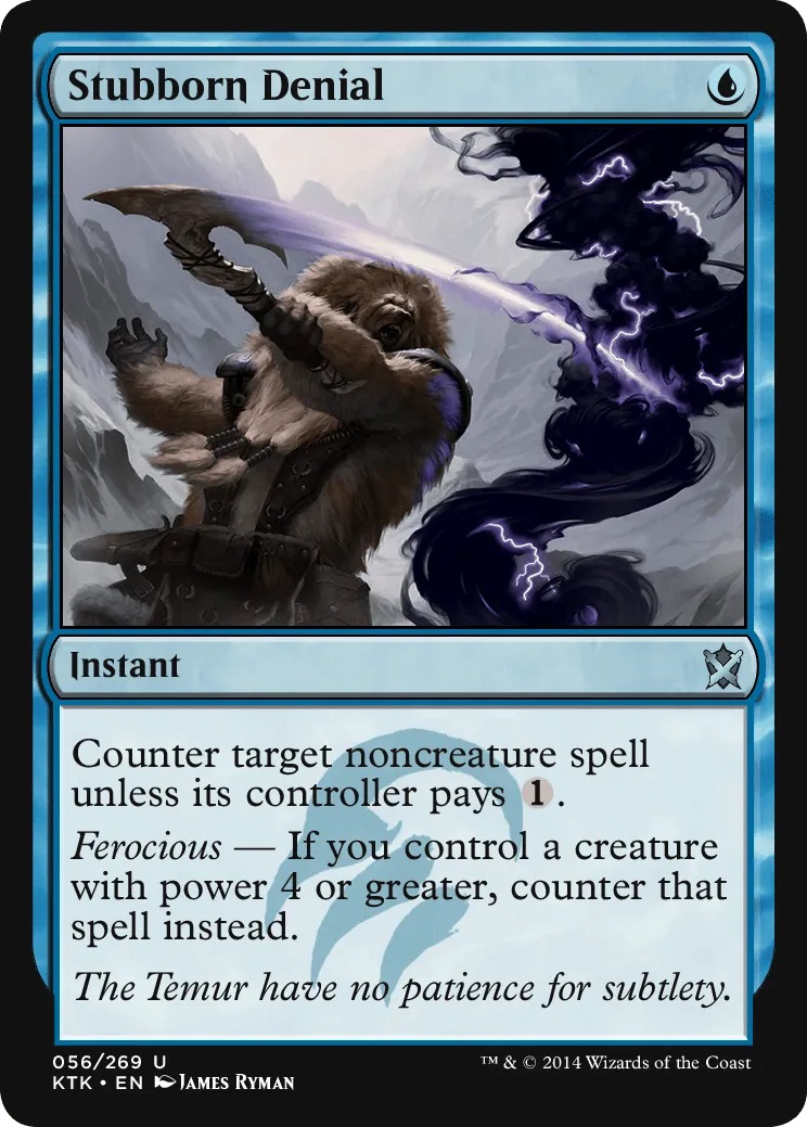 Stubborn Denial (U), from Khans of Tarkir (2014), counters a non-creature spell (or any spell with Ferocious if you control a 4+ power creature). In Modern, it’s a staple in Izzet Prowess or Simic Infect, leveraging big creatures like Murktide Regent.