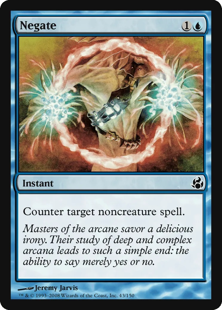 Negate (1U), from Morningtide (2008), counters non-creature spells, targeting artifacts, enchantments, and Planeswalkers. It’s a Standard, Modern, and Commander sideboard staple in metas with cards like Teferi, Time Raveler, or Smothering Tithe.