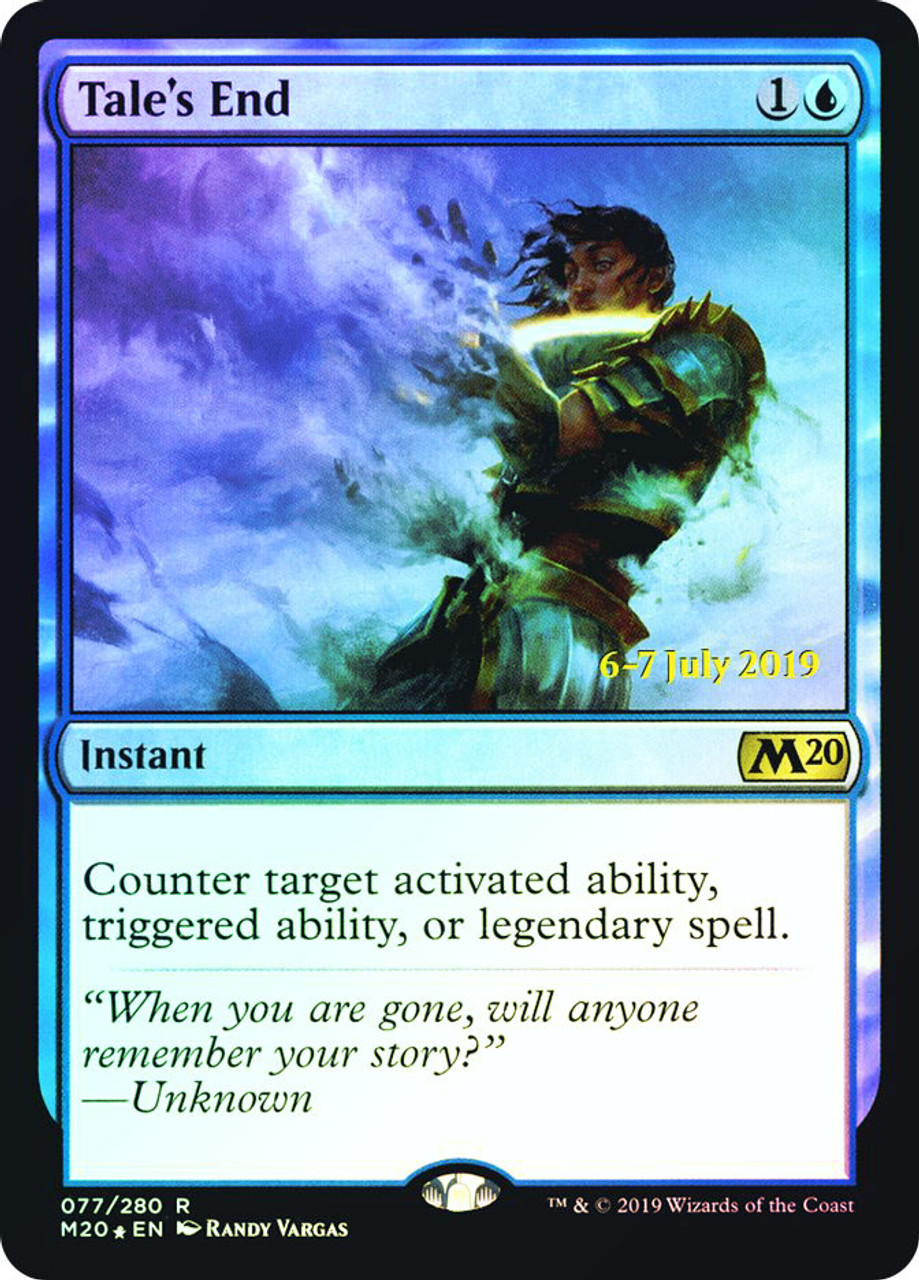 Tale’s End (1U), from Core Set 2020, counters a triggered ability or legendary spell. In Commander, it stops commander abilities (e.g., Korvold’s sacrifice trigger) or bombs like Ugin. In Standard and Pioneer, it’s a sideboard pick in legendary-heavy metas.