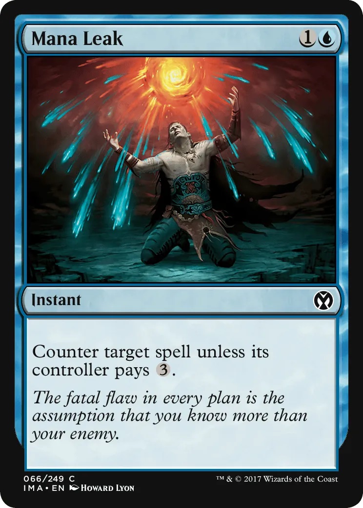 Mana Leak (1U), from Stronghold(1998), counters a spell unless its controller pays 3. Its early-game disruption shines in Standard and Modern tempo decks like Azorius Spirits, taxing opponents’ mana curves.