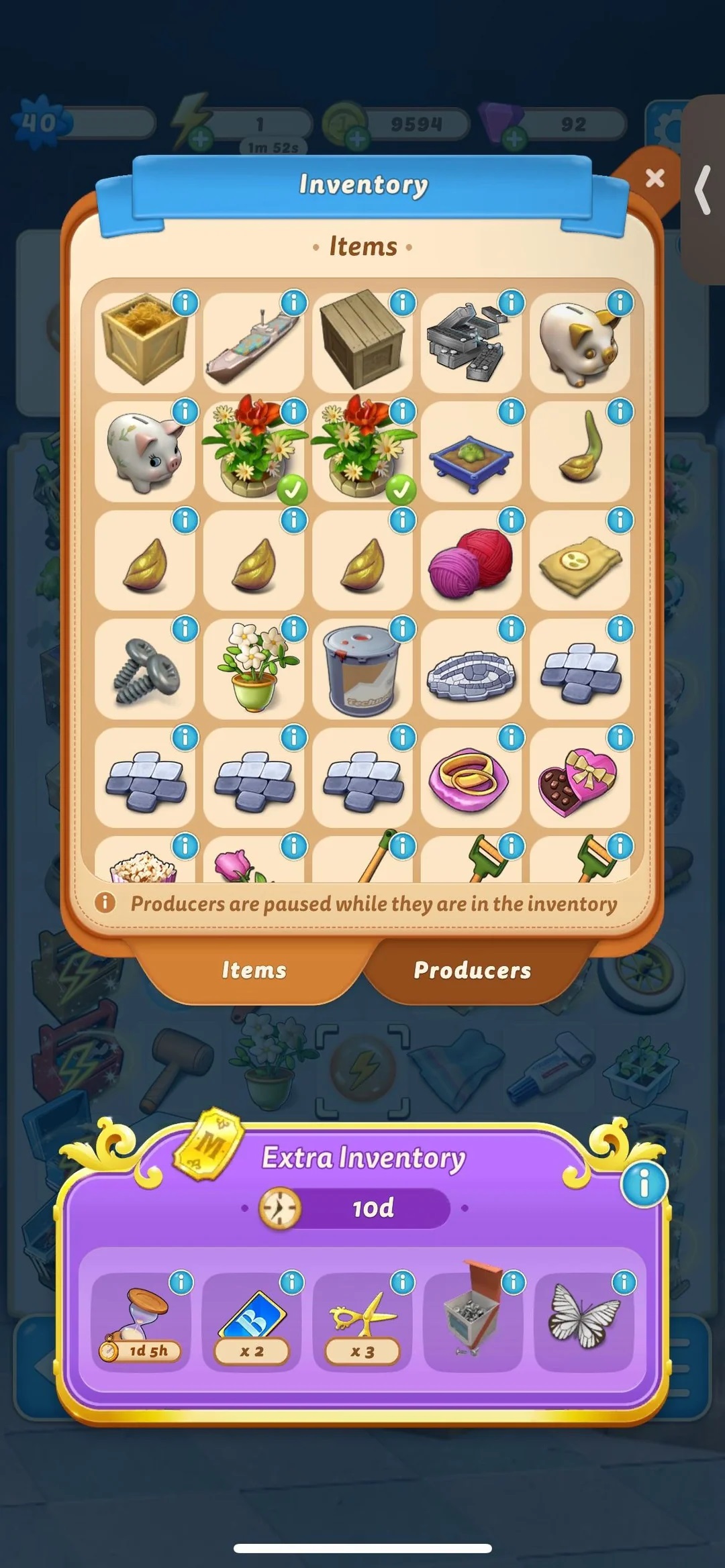 Merge Mansion in-game screenshot showing the Inventory screen with various merge items and producers.