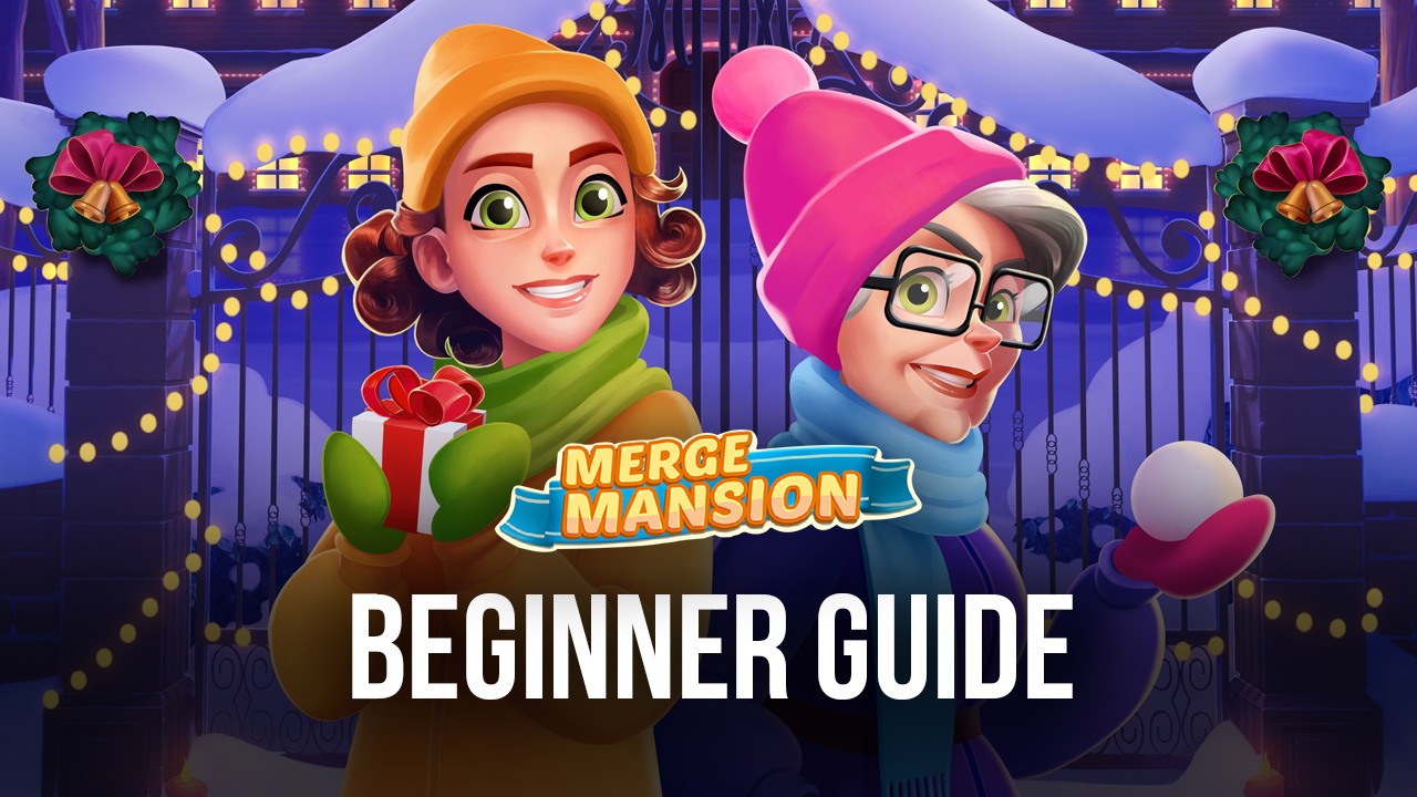 Merge Mansion game art featuring Maddie and Grandma Ursula in winter outfits with a 'Beginner Guide' title, snowy gates in the background.