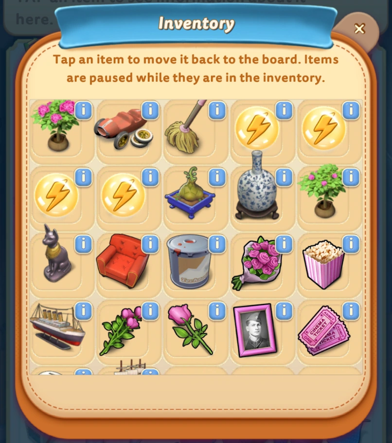 A grid of 20 Merge Mansion inventory items, including energy orbs, tools, flowers, and mystery quest objects. Most slowdowns come from chain confusion, not story confusion. Once the item logic is clear, many blocked tasks solve themselves.