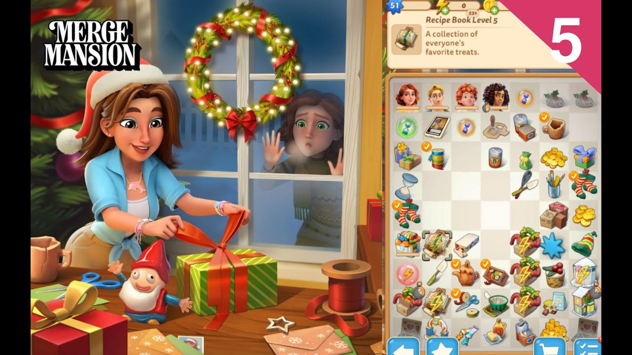 Merge Mansion Christmas event art showing Maddie wrapping gifts alongside a screenshot of the seasonal game board. Events are part of the same progression system, but they follow their own access rules and categories.