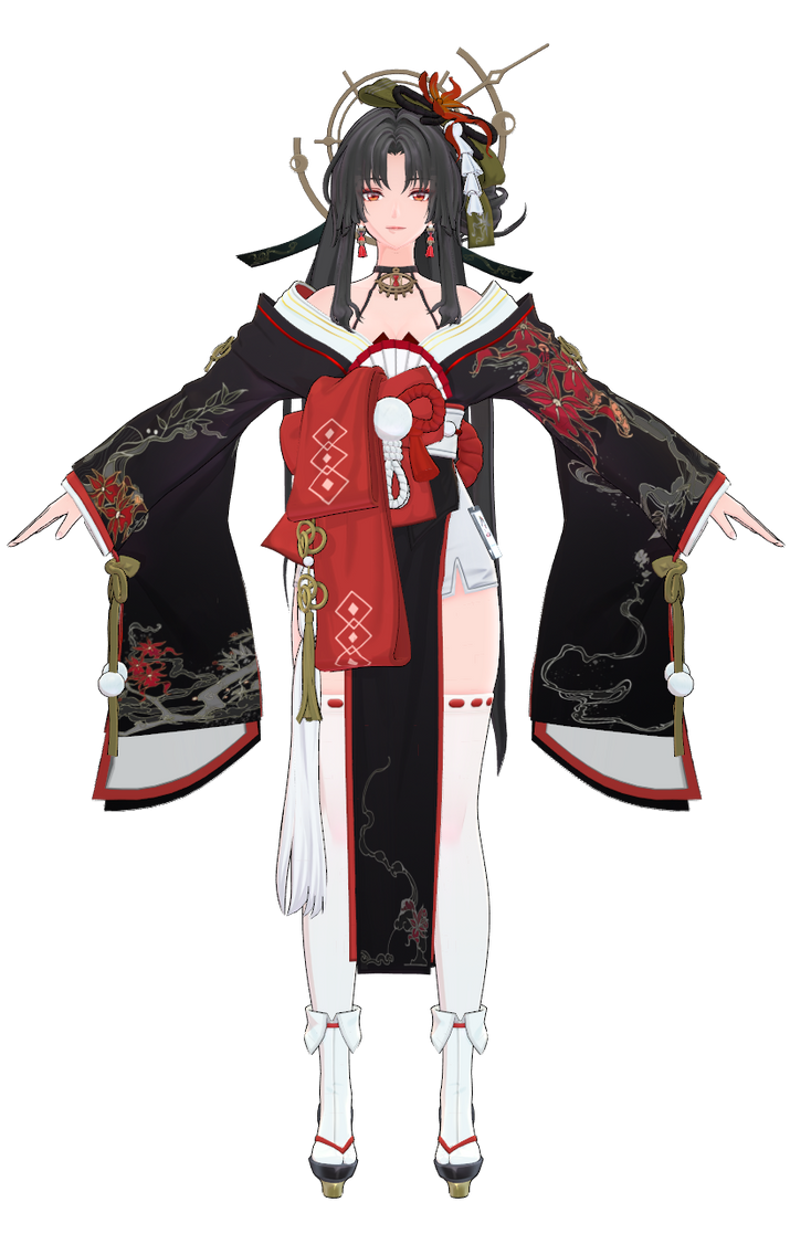Hotori character from Neverness to Everness wearing a black and red kimono-style outfit with traditional accessories. Role:Utility Support