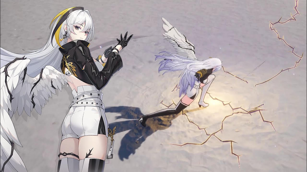 Hathor character from Neverness to Everness with white hair and wings performing an attack in gameplay. Hathor has an interesting design but lacks consistent combat impact.