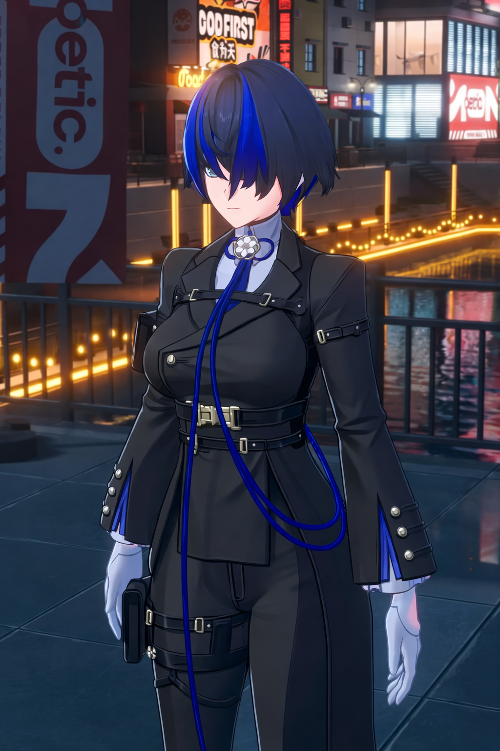 Daffodil character from Neverness to Everness with short black and blue hair standing in a neon-lit city street. Daffodil’s skill information remains partially limited in public builds, making evaluation difficult.
