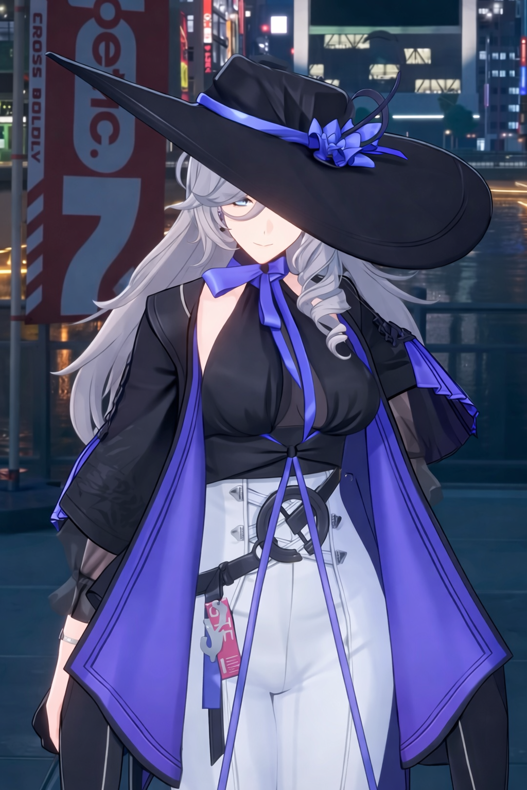 Jiuyuan character from Neverness to Everness wearing a large black hat and purple outfit in anime-style artwork. Jiuyuan’s kit appears more situational compared to other S-rank characters.