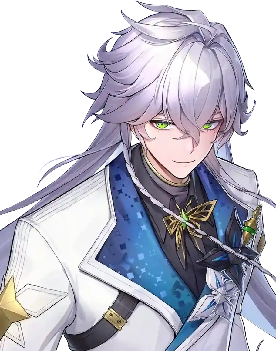Baicang character from Neverness to Everness with silver hair and green eyes wearing a white coat in anime-style artwork. Role:Incantation DPS